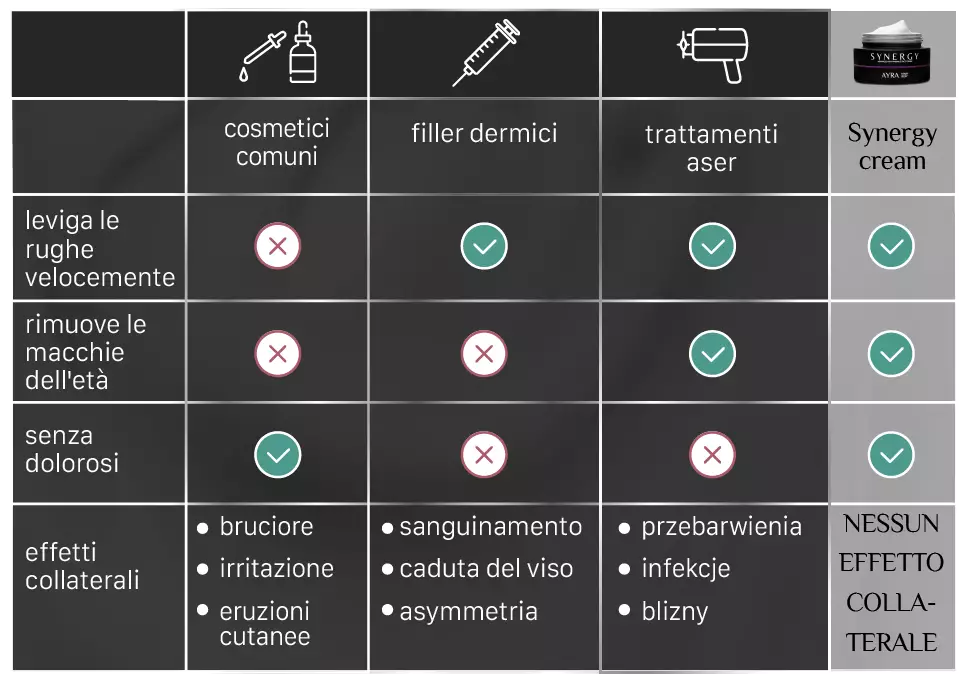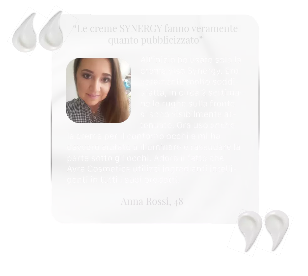 Ordina oraApplicati insieme, Ayra Synergy Face Cream garantiscono una tripla azione ringiovanente che ripara tutti i segni della vecchiaia